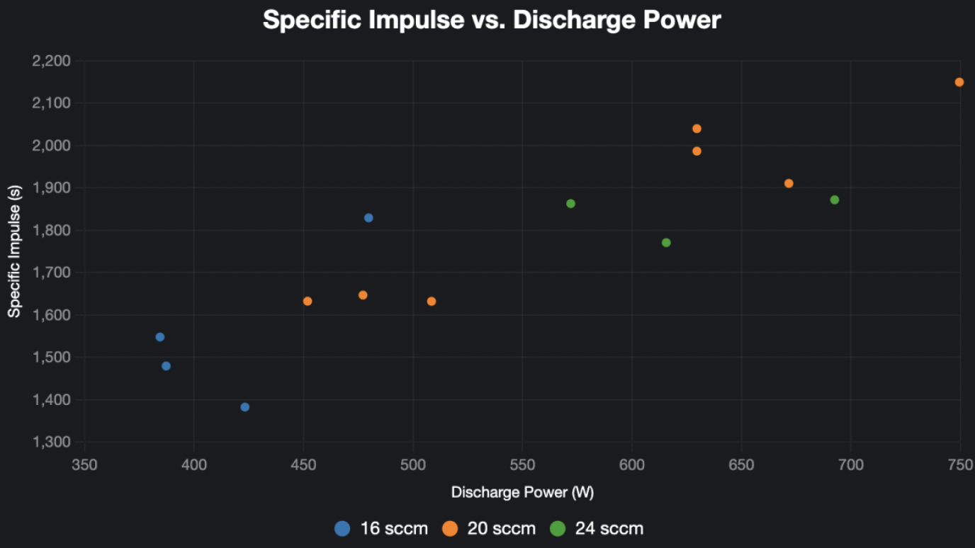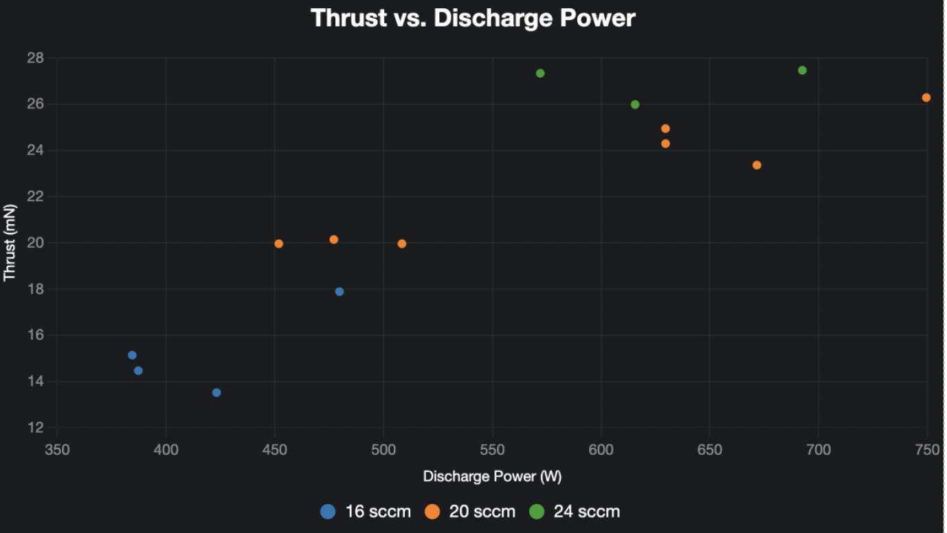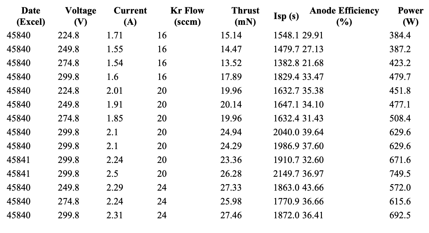 Tests were conducted on January 26-28, 2024, using a dataset spanning 220 W to 5040 W anode power, voltages up to 250 V, and mass flow rates of 1.87-9.35 mg/s for Kr and Xe. Key metrics—thrust, Isp, and anode efficiency—were measured, with data validated against numerical simulations from the CDR. The thruster operated below its full 10kW capacity to assess initial performance, with plans for higher power testing.