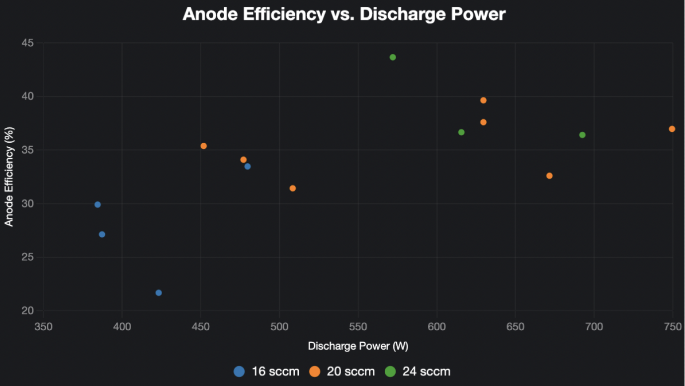 Anode efficiency peaked at 31.4% at 200 V and 4-9 mg/s flow, a solid foundation for optimization. The CDR’s 65% target is within reach, as efficiency scales with power and voltage, areas of active refinement by Pulsar.